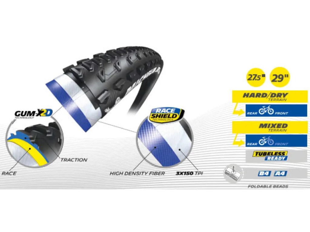 * Plášť je velmi výkonný díky gumové směs Gum-X2D, která v sobě kombinuje dva typy gumy - základní vrstva Race Compound, která je přímo propojená s přenosem síly ze šlapaní a vnější vrstva, která se stará o maximalizaci přenosu síly bez nutnosti oslabit trakci.